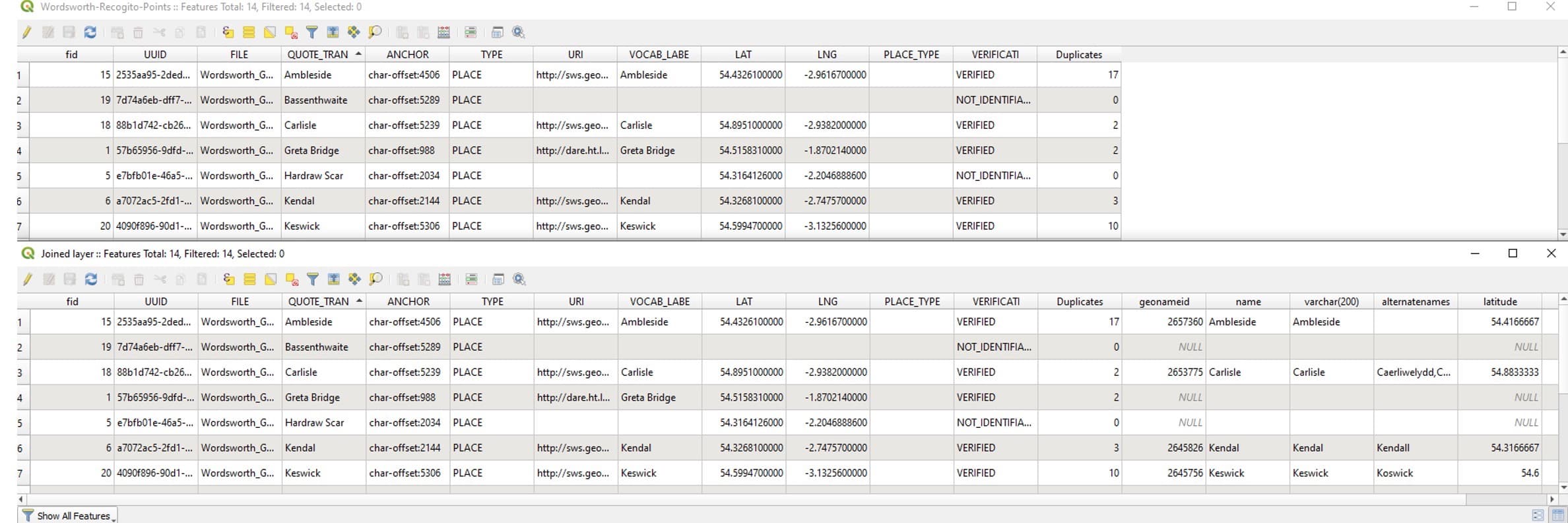 The vast majority of these places are not needed for our purposes, however. We can join our Wordsworth-Recogito-Points data to GeoNames’ GB_Gaz to create a new layer that combines this data.