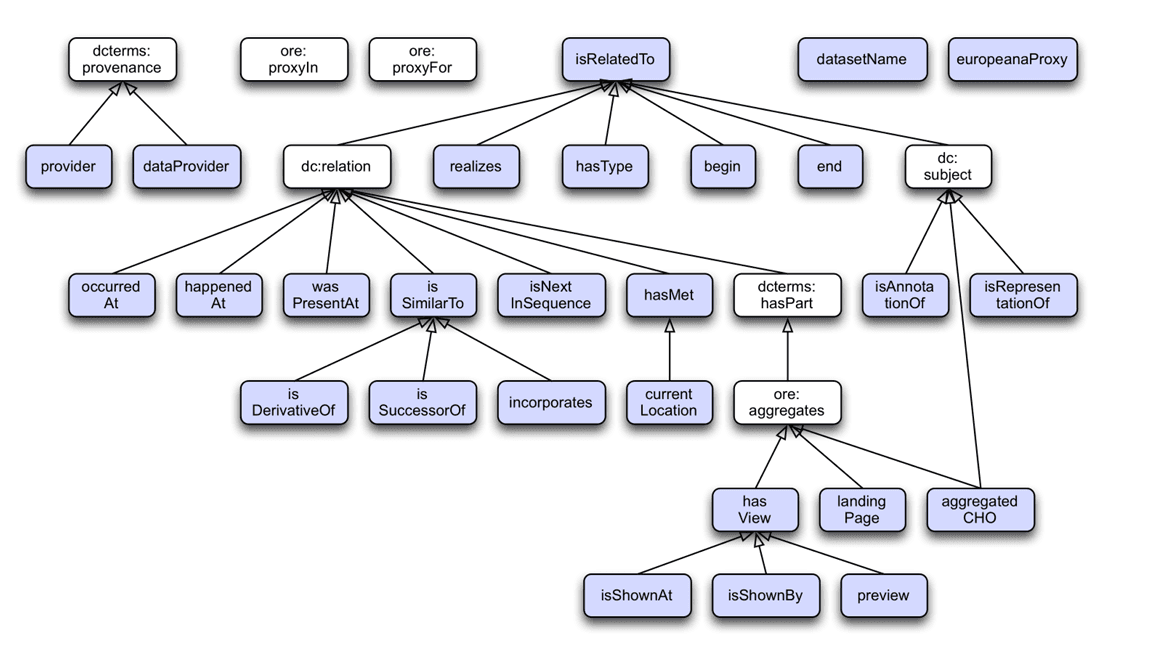 Fig. 6: The EDM property hierarchy, excluding part of relationships borrowed for readability. Source: Definition of the Europeana Data Model v5.2.8, https://pro.europeana.eu/files/Europeana_Professional/Share_your_data/Technical_requirements/EDM_Documentation//EDM_Definition_v5.2.8_102017.pdf