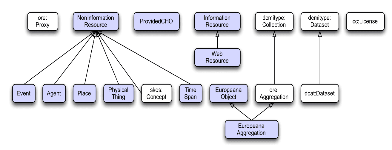 Fig. 5: The EDM class hierarchy. Source: Definition of the Europeana Data Model v5.2.8, https://pro.europeana.eu/files/Europeana_Professional/Share_your_data/Technical_requirements/EDM_Documentation//EDM_Definition_v5.2.8_102017.pdf