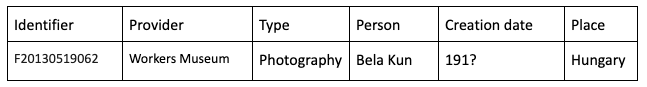 For instance, looking deeper into Costis’ dataset, Prof. Lorena selects two different objects from the Europeana results related to the same topic: an image provided by the Workers Museum depicting Bela Kun (illustrated in Fig.2), one of the leaders of the Hungarian Revolution, and a text containing a speech by the same person (illustrated in Fig. 3). Using these two records, which are related to the same person, she explains to Costis the importance of documenting this information not by plain text, but by representing this person as an entity. By doing so, all records associated with that person can be related to this entity, resulting in a rich representation of all the available information about Bela Kun.