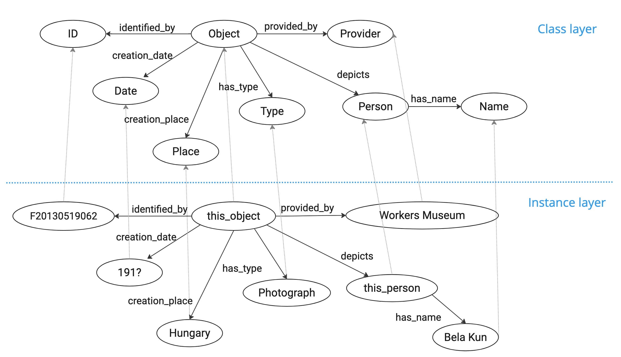 She explains that entities and relationships can exist in two different abstraction layers: one containing atomic entities (real-world instances) and their relationships, and another capturing information about sets of entities, called classes, which are the categories that atomic entities belong to. When constructing a conceptual model, the instance level graph follows the structure of the graph at the more abstract class level. This is evident in the current example, as shown in Fig. 4, where the information about the selected photograph appears at the lower level and follows the same structure as the graph in the upper layer. Edges coloured in light grey in the figure indicate the class that each instance belongs to.